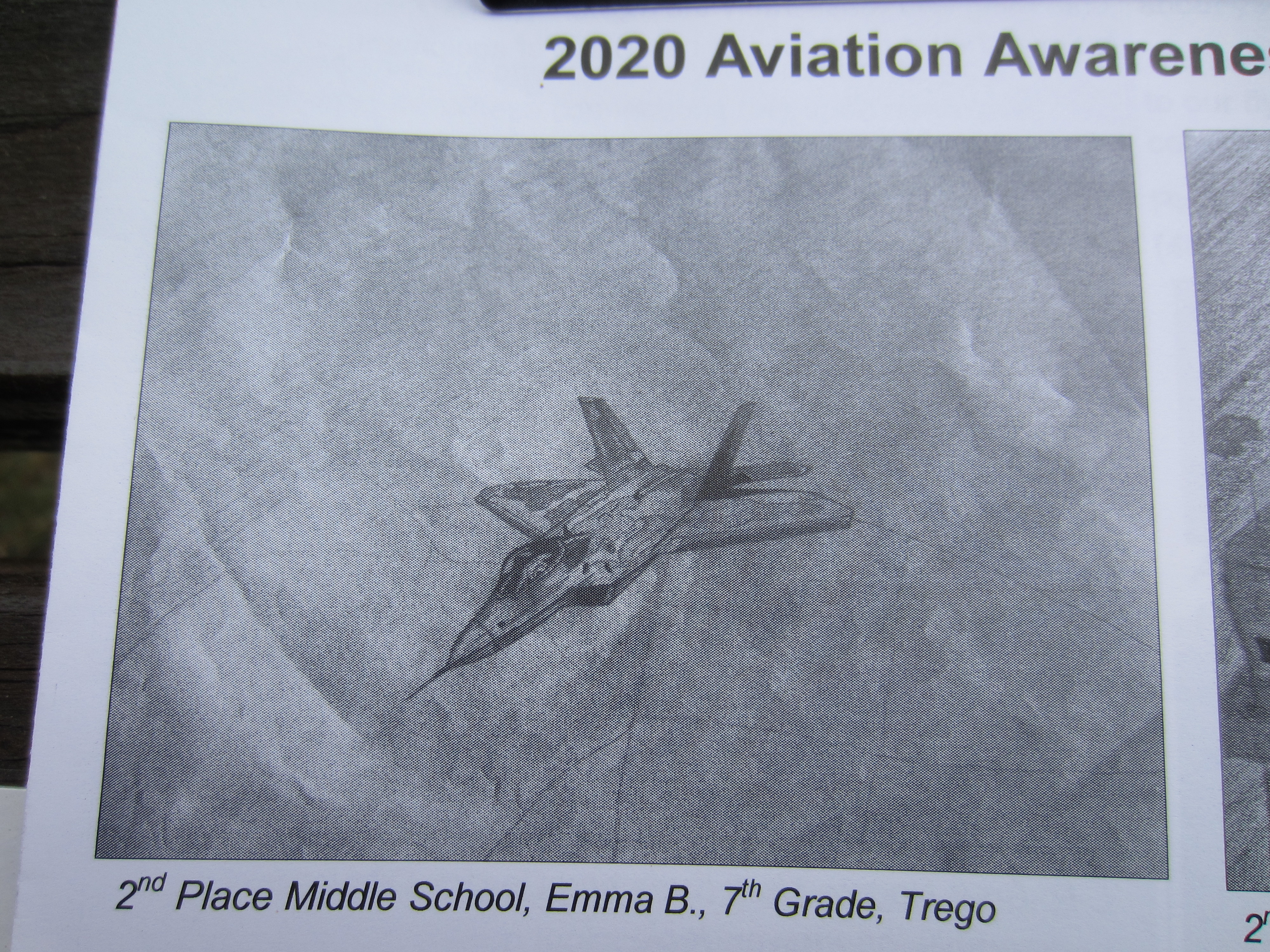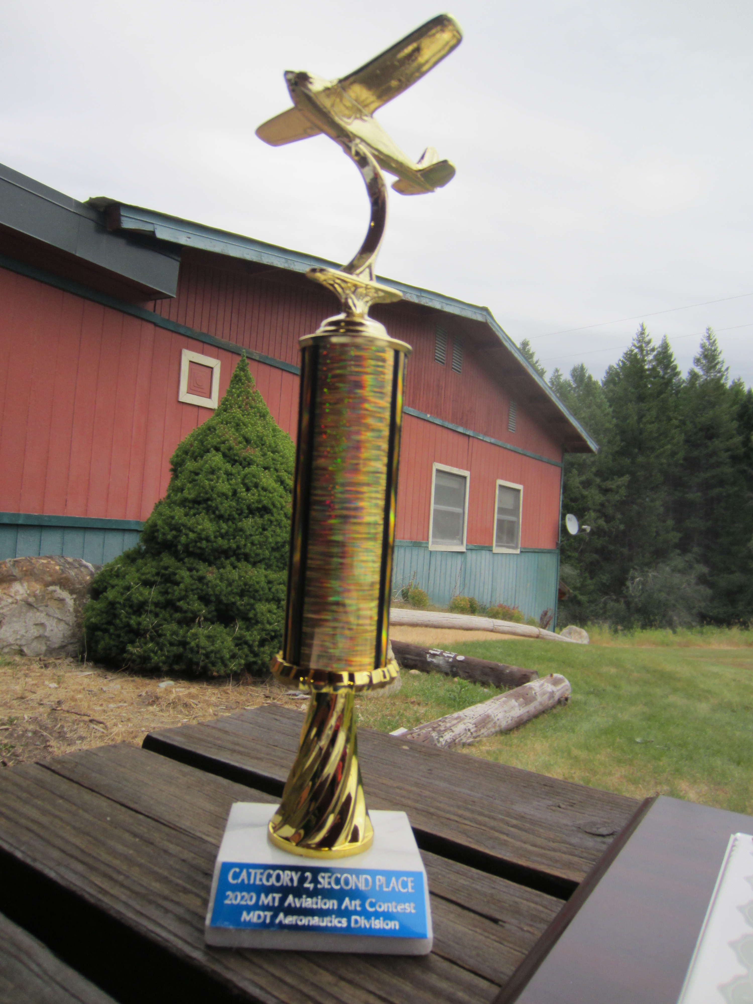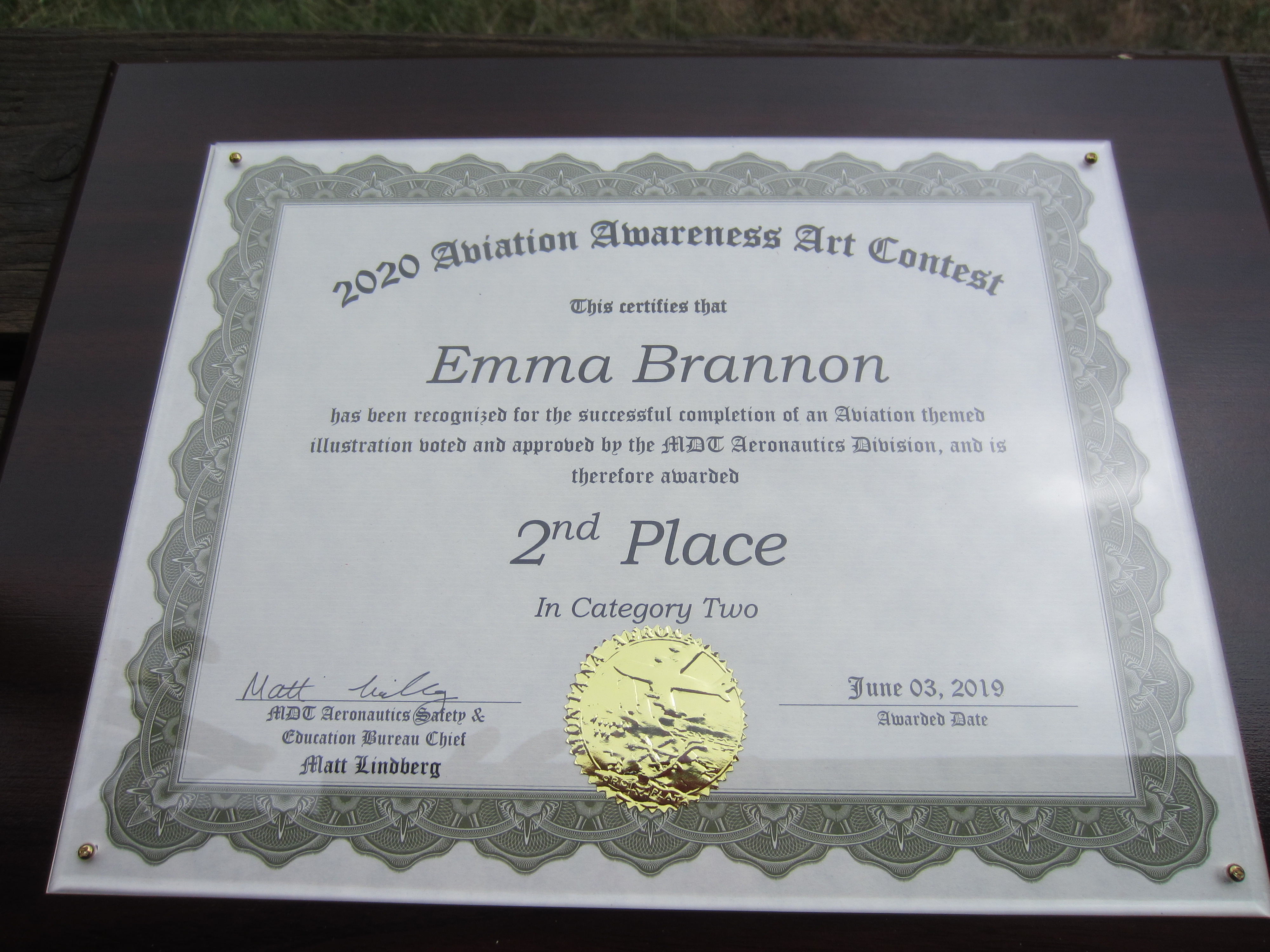 Finally, with the paperwork, was a trophy. Ms. Emma Brannon won second place in the 2020 Aviation Awareness poster contest she entered during the previous school year. Congratulations, Emma.