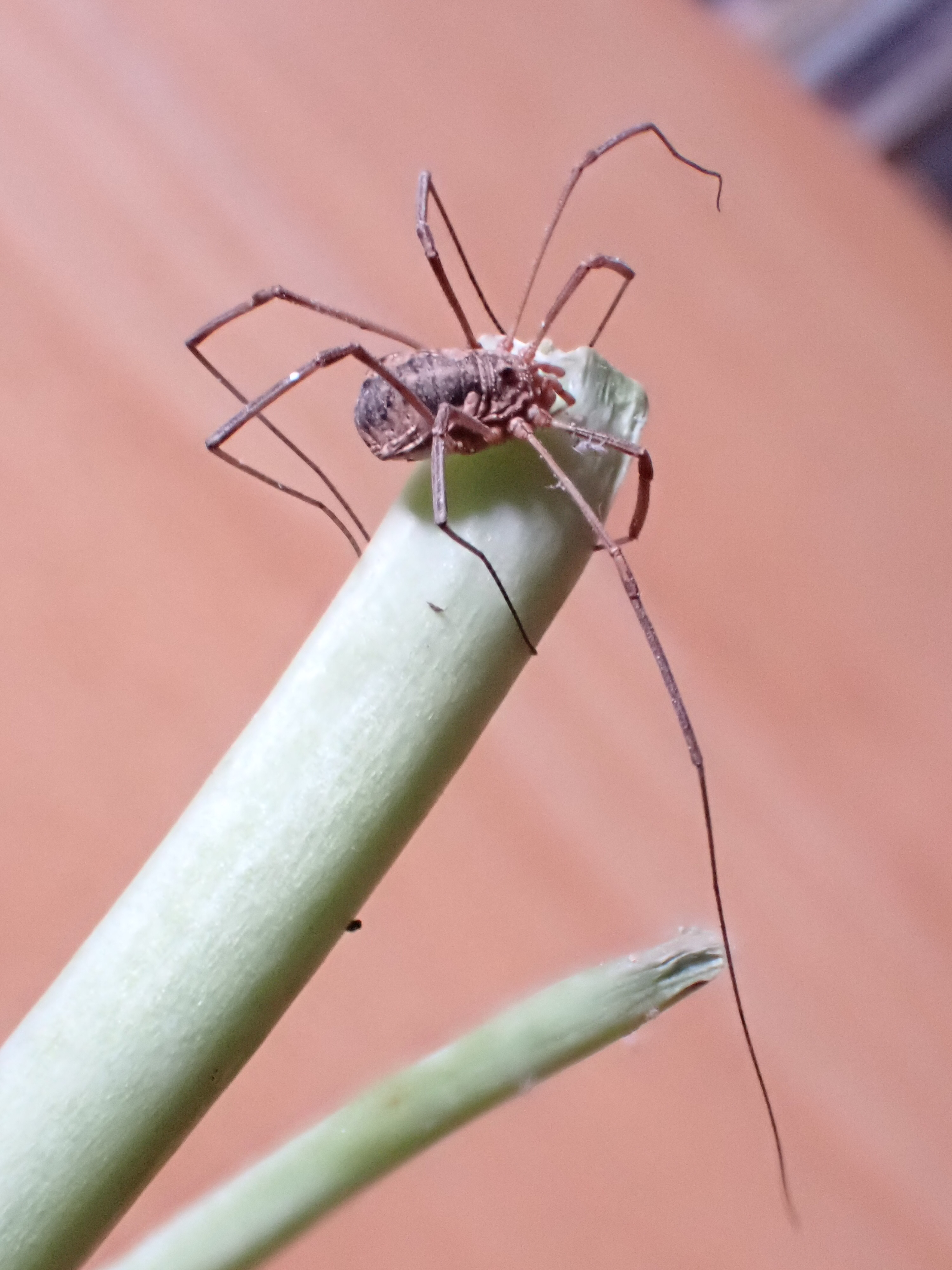 Earlier this week, I met a Harvestman while making supper. It had stowed away on some kale from the garden, and was still walking about on it… even after a week or so in the refrigerator.