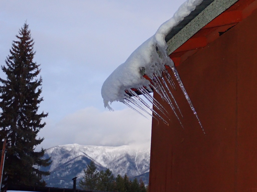 Another day with temperatures warm enough for melting, and there’s a bit of water below that ice sheet. It slides. Gradually, in increments, the ice sheet makes its way off the roof. Icicles, which had previously hung straight down begin to curve.