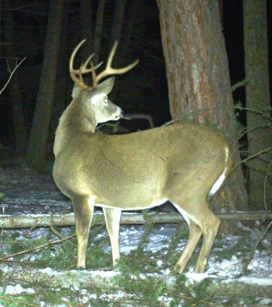 The little dog found the body – the buck had been hit by a vehicle, two legs broken, his head cut off, and left in the ditch by the pond. We had been watching him in person and on the game cam – a young buck with a lot of potential.