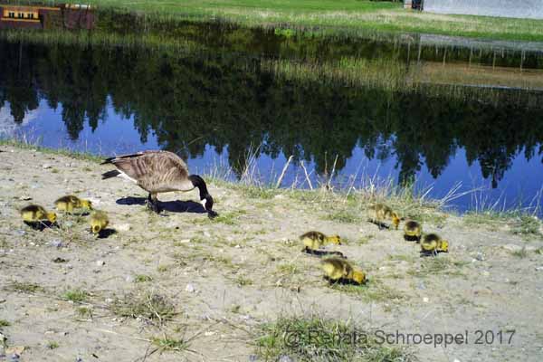 With the nest unavailable, the two are hanging out in the Salina Wild Rye – good cover, close to the nest site, and, as soon as the ice melts, Goose will be back on her nest, hatching out another group of goslings. Her first year, she led the flock on a hike around the pond, straight through the grass into an eagle that was dining on a road-kill cat. Since 2015, Gander has taken responsibility for leading all the land trips. That first year, as two eagles flew over the nest, Gander took to the air to divert them, then flew over me low, and made a couple circles as the eagles flew on away from Goose. The next Spring, he decided to use me as part of his threat to a larger pair of geese that wanted the nest site.