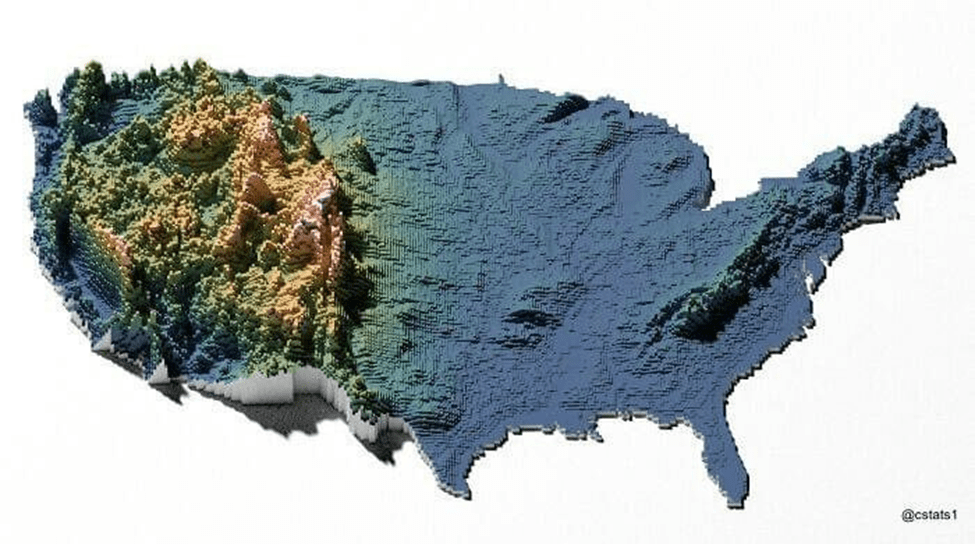 This next map gives an appreciation of how much relief there is in the west. The link to the article that includes many more maps is at the bottom – well worth clicking it and seeing more.