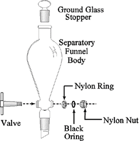 Chemists have an old axiom that “like dissolves like” with regard to polarity. That is, polar compounds dissolve other polar compounds and nonpolar compounds dissolve other nonpolar compounds. Water is polar, whereas gasoline is nonpolar. Ethanol exhibits moderate polarity and mixes with gasoline. The ethanol, however, dissolves better in water. Thus, if a person mixes gasoline and water, the two liquids will separate into layers with the water on the bottom. Vigorous mixing of the mixture, however, will transfer the ethanol from the gasoline to the water, where it is more soluble. The separation is then just a matter of “pouring off” the gasoline. Chemists perform this operation somewhat more elegantly with a piece of glassware called a separatory funnel, which simply consists of a cone-shaped flask with a rotating valve at the bottom. Fill the separatory funnel about one-fourth full with water, making sure the stopcock is closed so no liquid flows out the bottom of the funnel.”