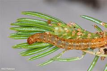 Now the Western Spruce Budworm has some wide-ranging tastes – Brooks describes it: “Western spruce budworm (WSB) is native insect and is the most widely distributed and destructive forest defoliator in western North America. Susceptible tree species include Douglas-fir, true firs and spruces. Larvae will also feed on pines and other conifers when insect populations reach outbreak levels. Buds, current year foliage, and developing cones are fed on voraciously. Larvae initially feed on new needles throughout late spring and early summer causing a red-halo appearance on outer portions of infested branches.”