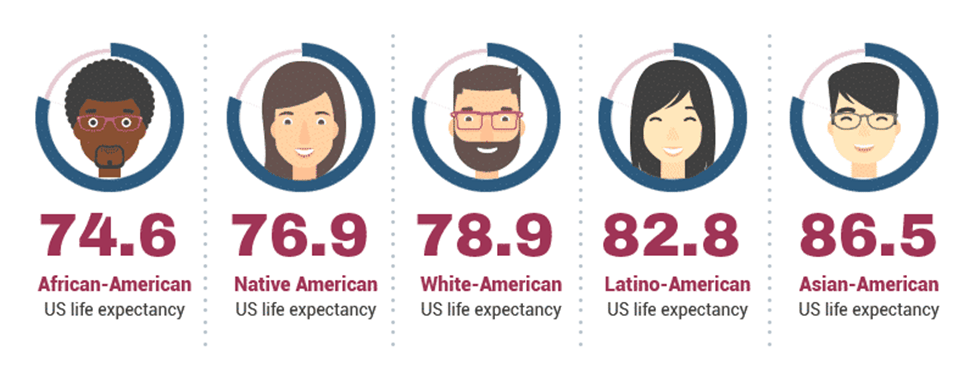The 11.9-year gap between Asian American and African American life expectancy. 60% of the deaths in the gap were from heart disease, cancer, homicide, diabetes, and mental health conditions. African-Americans in the US are more likely to die from heart disease White-Americans suicide rates are twice as likely than African-Americans Latest available data is from 2017 – OECD