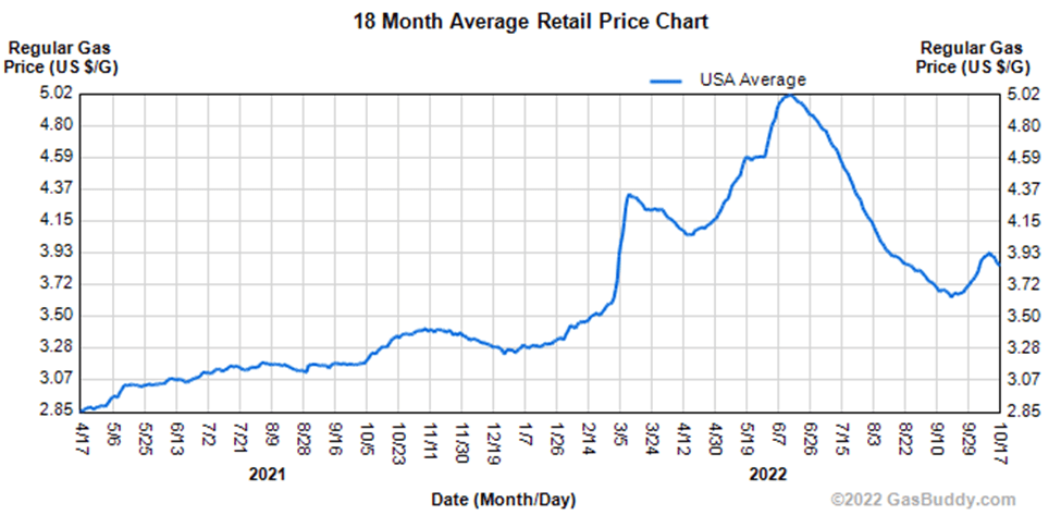 This chart (from Gasbuddy.com) shows that we made it to $5.02 last June. Still, with November and December yet to come, and the OPEC cuts coming next month, I’m betting we’ll go higher.
