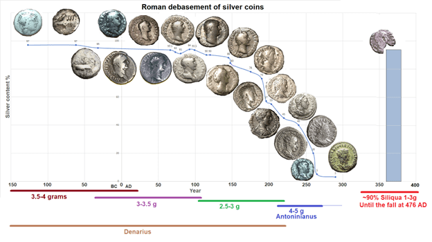 “Roman emperor Nero began debasing Roman currency around 60 AD by reducing its silver content from 100% to 90%. Over the next 150 years, the silver content was reduced to 50%. By 265 AD, the silver content was down to 5%.