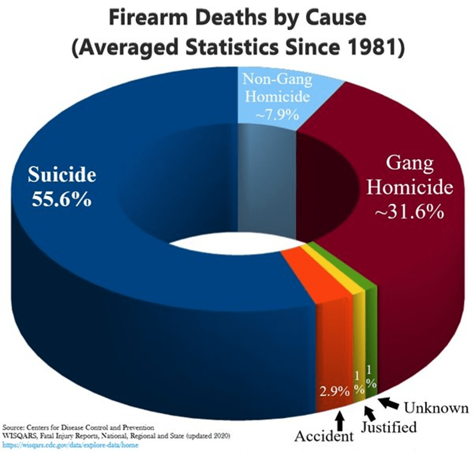The chart, from CDC, provides a specific perspective – that, since 1981, 55.6% of gun deaths were suicides, and that 31.6% were gang homicides. It kind of makes the “gun control” legislation – like banning 30 round magazines and “assault type rifles” look a little bit ineffective. I don’t like suicide – permanent solutions to temporary problems aren’t something I approve of (kindly ignore the dangling preposition).