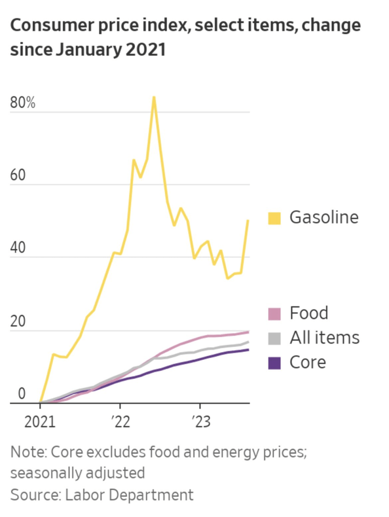 The next chart – with data from the labor department – gives a bit of a perspective on how we’re being affected by inflation. As I look at the gasoline costs, I really wonder if I shouldn’t be getting a second-hand Smart car to drive instead of the Talon . . . but as a child of the sixties, it’s nice to drive something that gets with the program when my right foot gets heavy.