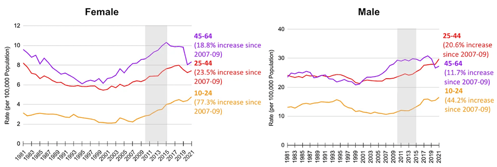 Jonathan Haidt has published an article on suicide rates, contrasting different English speaking nations. I’ve excerpted his US graphs – but the whole article covers a lot more, and is well worth reading. Look at the graphs here, and if they get your attention, click the link and read his article.