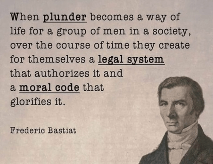 “Sometimes the law defends plunder and participates in it. Sometimes the law places the whole apparatus of judges, police, prisons and gendarmes at the service of the plunderers, and treats the victim – when he defends himself – as a criminal.”