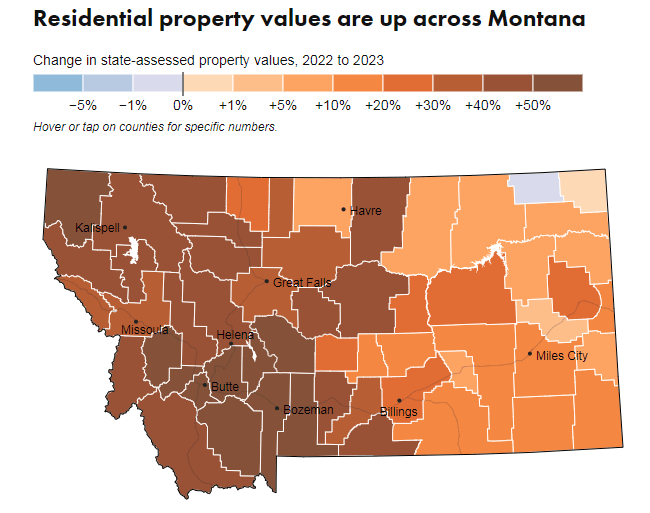 What the property tax timeline shows is that property tax rates haven’t increased especially. It excludes property values, however, which changed significantly in the last reappraisal. The Montana Free Press estimated that on average, property taxes went up 21%. This image (from the Montana Free Press) illustrates the significant increase in property valuations.