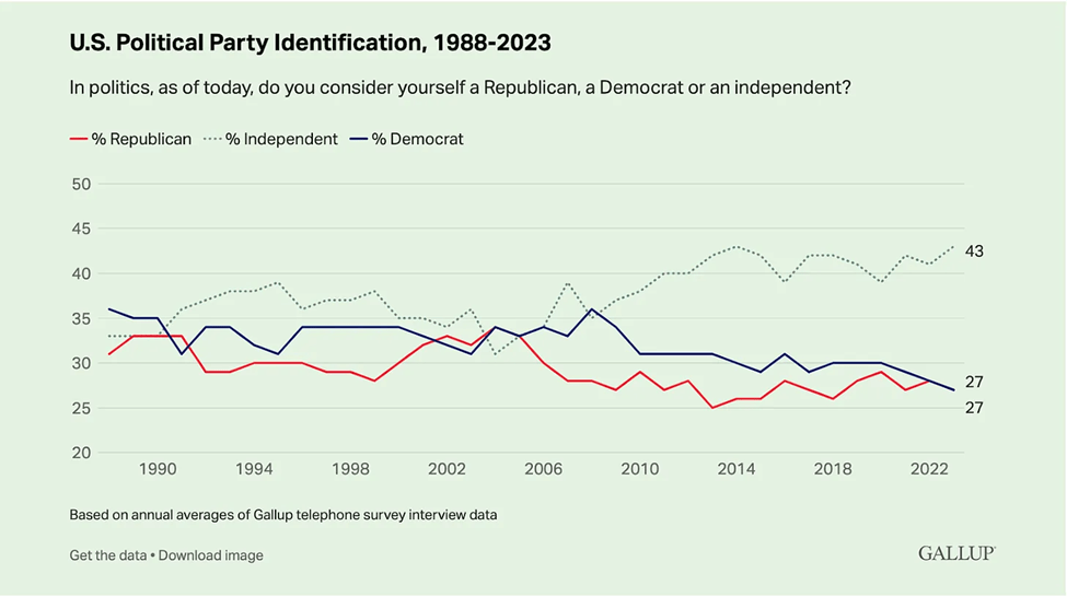 We’re at a point where only 27% of Americans identify as Democrat, another 27% as Republican, and 43% as independent. I’m not a good enough pollster to be telling Gallup the questions to ask – but I am interested in the decline of party identification. Can it be that we’re watching each machine shaft us and beginning to despise both parties? Perhaps we need a different question: “How poorly does the Democrat/Republican party represent you?” Millard Fillmore was the last Whig party president – and we may be looking at a need to develop two new parties.