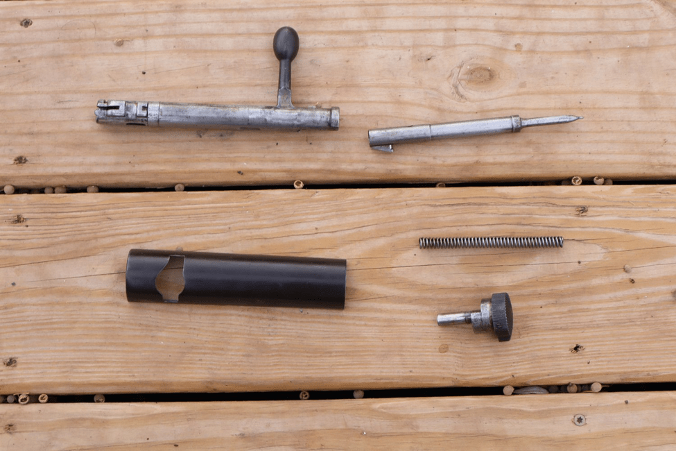 So later, I got my hands on a Type 38 Arisaka – and learned that Jack Price had been hunting around Trego for years with one he brought back from the war in the Pacific. While we know the rifle as an Arisaka, the Type 38 was actually designed by Kinjiru Nambu. I remain underwhelmed by Nambu’s pistols – but he simplified and smoothed the Mauser bolt as he modified it for the type 38 – it’s down to six parts.