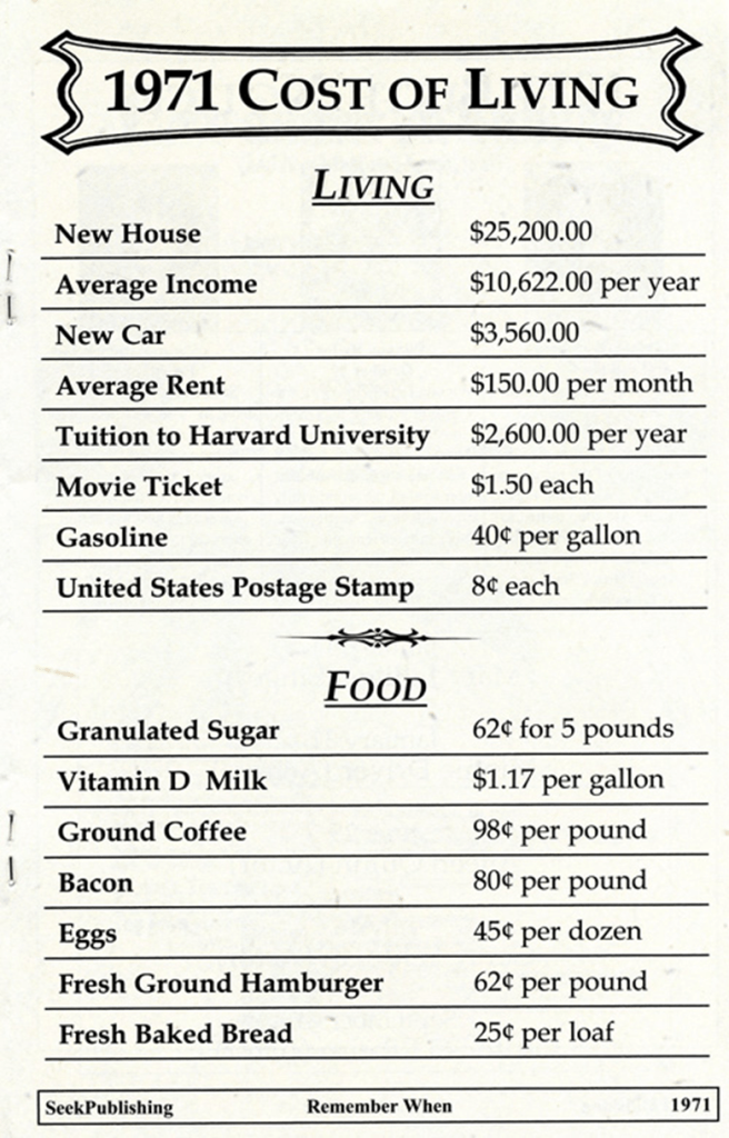Gasoline was 40 cents per gallon. Now it’s somewhere between three and four dollars per gallon, and adulterated with alcohol. Then it was adulterated with tetraethyl lead. We aren’t buying the same gasoline. Basically, that dollar in 1971 bought the same amount of gasoline as $10 does today – not nearly so inflationary as the gold spot price might indicate. This old ad gives an idea of the cost of groceries when I turned 21: