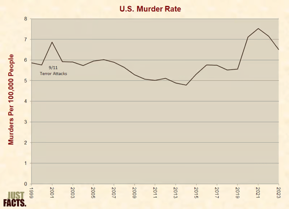 The graph shows that our murder rates – at least during this century have been fairly consistent – save for the bump on 9/11 2001 and another bump during covid.