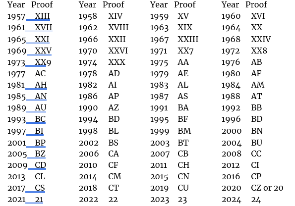 They started with Roman Numeral I in 1946 – but we’re not likely to find any replicas marked before 1957, so my chart starts then: