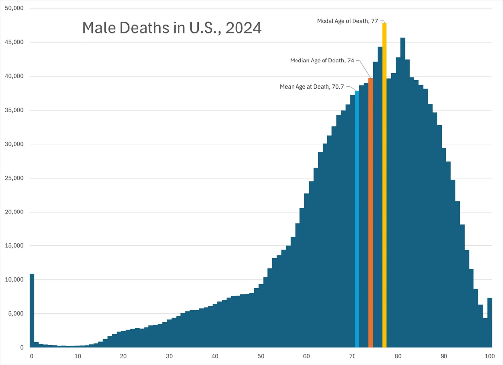 It’s quite a chart for a 75 year-old man to read – and note the columns she has emphasized – last year, for men, the mean age of death was 70.7, the median was 74, and the mode 77. As a brief explanation – the mean is the arithmetic average, the median is the middle value, and the mode is the most frequently occurring. Look at those numbers and think for a minute – for a guy who is 75, it isn’t surprising that it makes me feel infernally mortal. She’s still in her fifties, and female, so the chart isn’t nearly so personal for her. (She’s definitely worth reading and is at https://marypatcampbell.substack.com/p/rip-robert-redford-1936-2025-and?img=https%3A%2F%2Fsubstack-post-media.s3.amazonaws.com%2Fpublic%2Fimages%2F8c1e30b0-74f2-4108-a7a7-ed238182bd8a_3127x2268.png&open=false