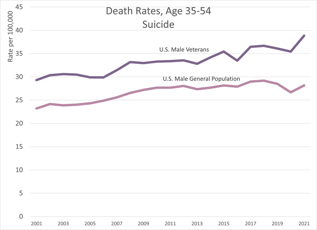 Mary Pat Campbell has written an article based on the Veteran’s Administration most recent report on suicides. She’s an actuary, so I tend to take her work a bit more seriously than a lot of others. The article is at: https://marypatcampbell.substack.com/p/movember-2024-vet2erans-and-suicide?utm_source=substack&utm_medium=email For folks who need a bit of encouragement to follow the link, here are a few excerpts: