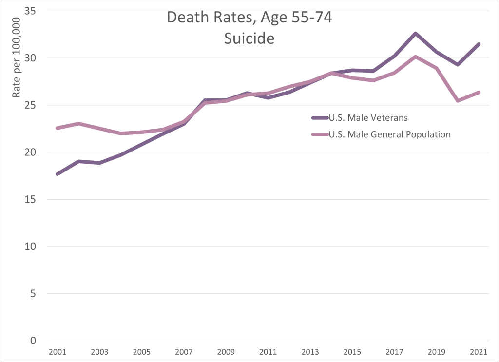 At my age, 75+, Veteran suicide rates are a bit lower than the general population: