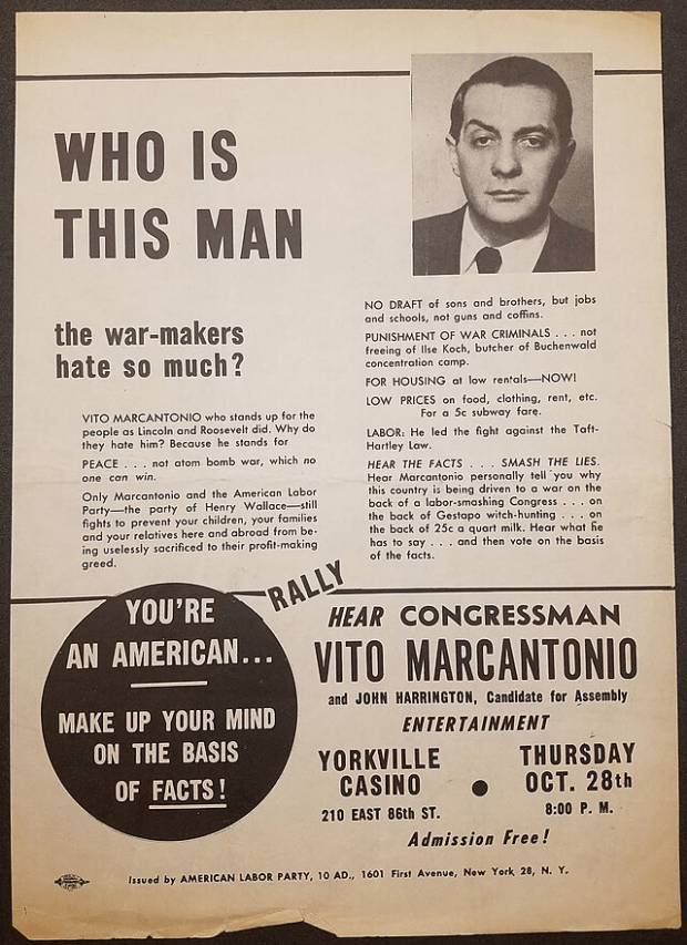 Congressman Marcantonio was first elected as a Republican in 1934 from Harlem. He lost the next election, then switched to the American Labor party and won six more terms. He ran for mayor of NYC in 1949, lost, and in 1952 the Dims, Repugnants and Libs backed a single candidate to beat him and succeeded in voting him out. The American Labor Party, lacking any representation in Congress died shortly after Vito (d. 1954).