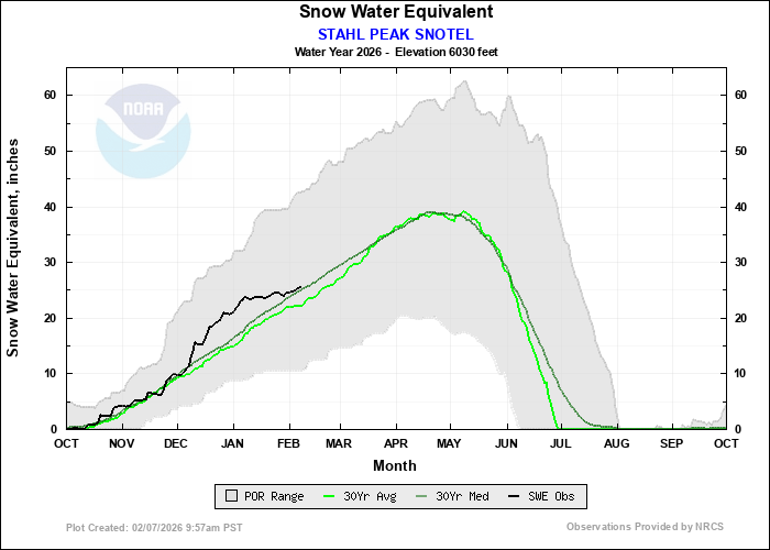 As a young man, I never thought that working snow surveys would prepare me for a career in demography – but populations are populations, whether of snowflakes or humans (and some humans are definitely snowflakes). When you’re dealing with populations, you don’t make predictions, you make projections – you project the line of the curve, adjusting for variables. This chart, taken this morning from the station at Stahl Peak, illustrates why projecting snow pack from the January 1 measurements is asking to be found in error. It’s not a lot different from projecting populations in counties that are at the edges of the bell curve – whether losing or gaining.