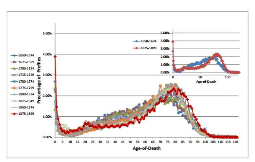 If you look at the curve, you will notice that it is not the classic bell curve – it is a skewed curve. Many curves are skewed – if we look at longevity, a couple centuries back, there was a huge death rate between 0 and 5 – infants and children died like flies. Along with improved medicine and drugs like penicillin, the skew on the left disappeared – but projections became no easier. The graph below, showing age of death at different times in our history shows a chart dramatically skewed to the left: