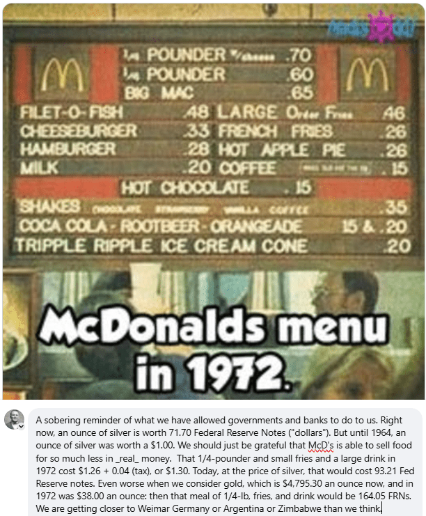 The high prices that gold, silver and platinum are bringing show the devaluation of the American dollar – but in terms of things that we do not deal with every day. This MacDonald’s menu, from 1972, makes it fairly easy to see the effects of inflation: