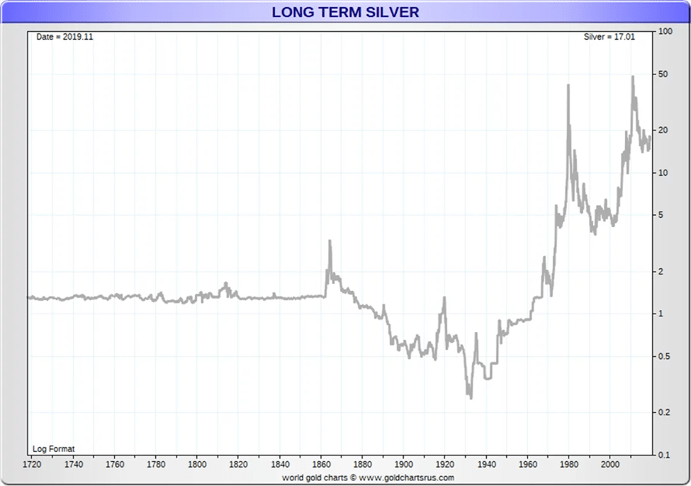 This graph shows the price of silver from 1720: (as I write this, the spot price is $24.18)
