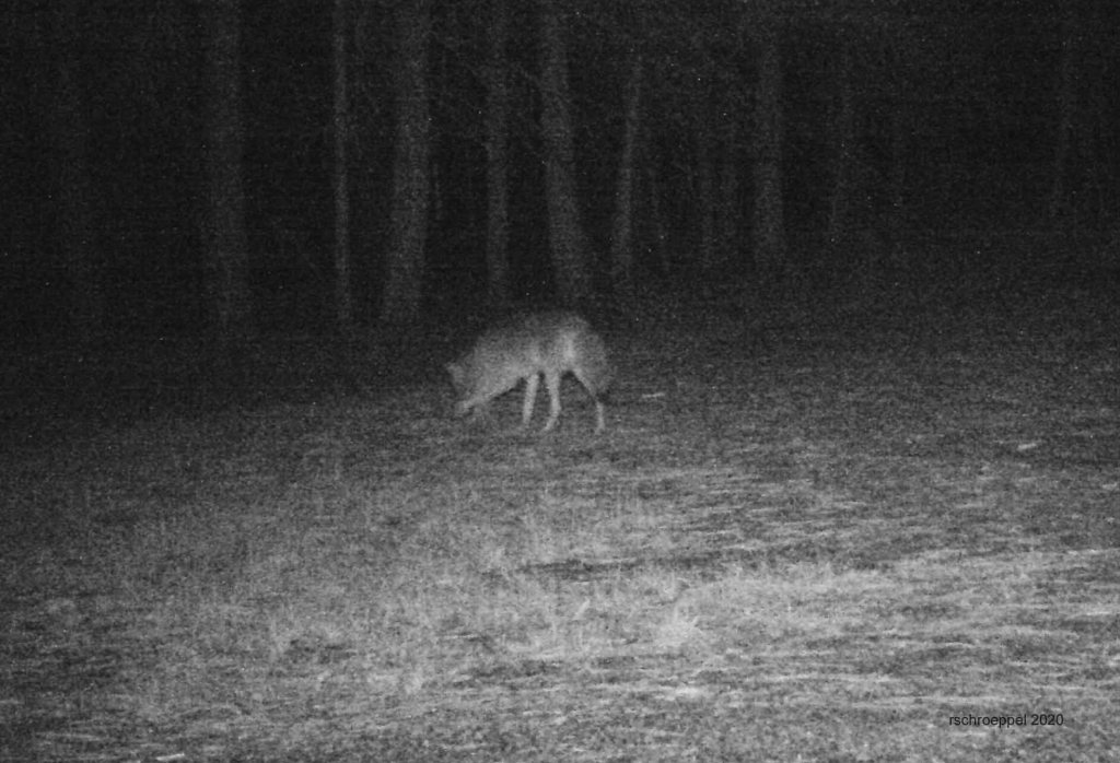 A coyote stops on the driveway at night. Nighttime photos are difficult. Common is the lack of clear detail.